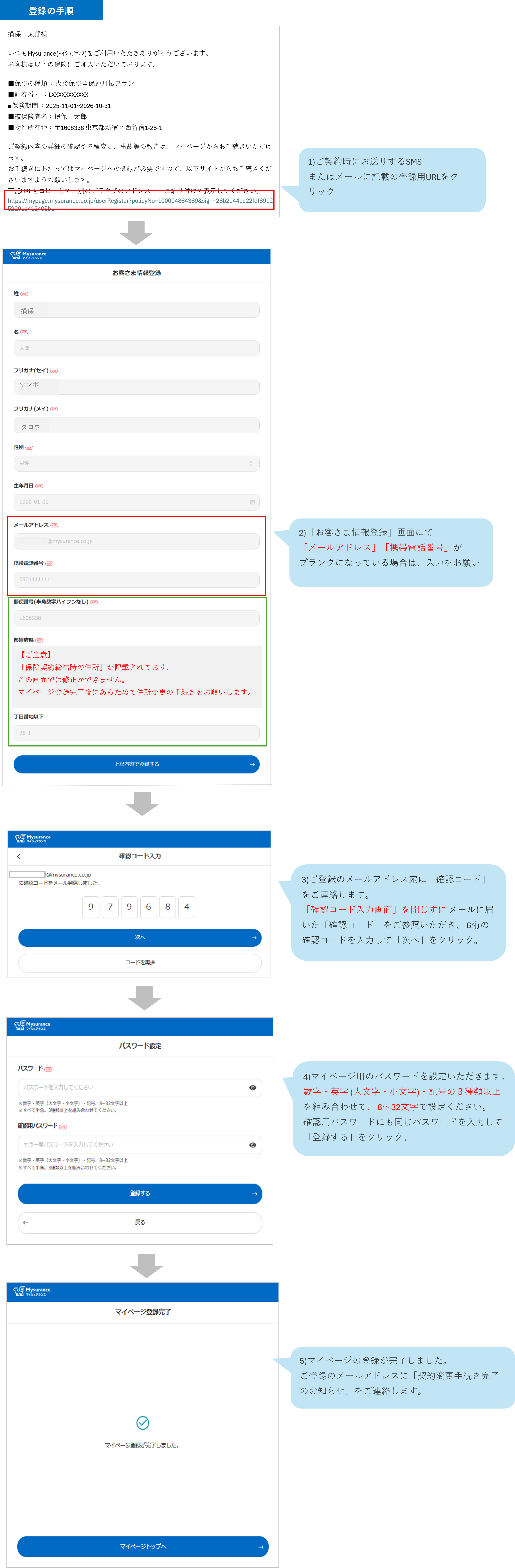 補償対象物件への住所変更は、マイページ登録完了後に「お客さま情報の確認・変更」から変更のお手続きをお願いします。